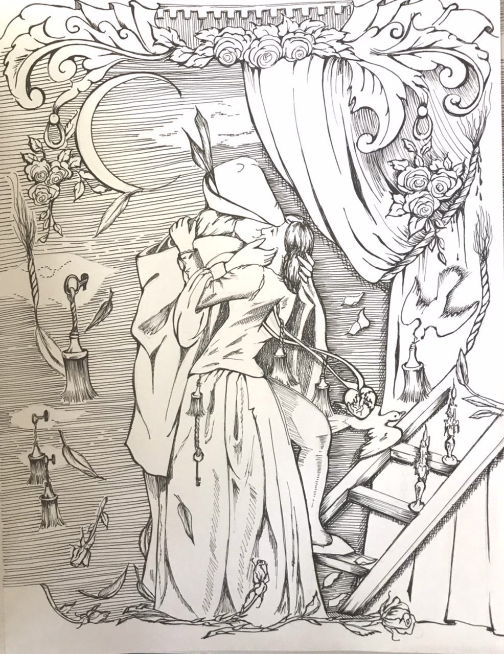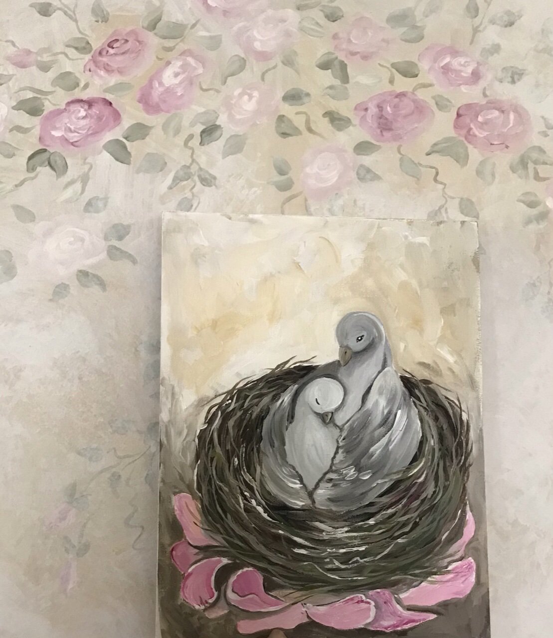 The 15th Two doves were waiting at the top of the driveway. I greeted them as I slowed down and watched before they decided to fly up into the tree canopy. They reminded me of us, of peace and love , of commitment and dreams, and the dream I just had that prompted me to paint them. I smiled at the mysterious gift.