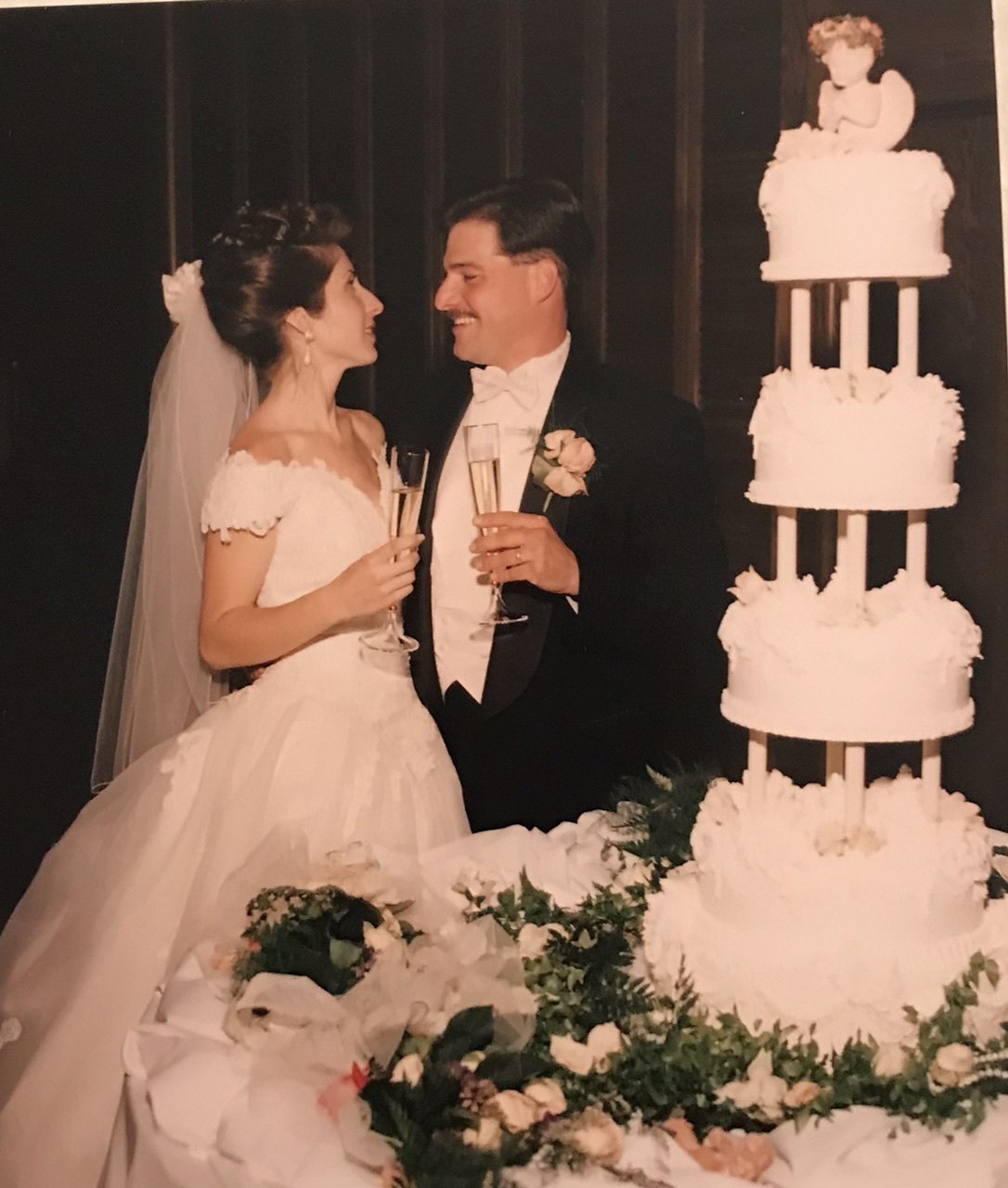 I chose this angel to top our enormous wedding cake. Elegant blown glass was a popular topper when we got married, but I was more than certain I wanted a simple Angel made of clay which I adorned with a halo of rosebuds. He was the proper symbol to crown the celebration of our marriage. Earthy and heavenly, gentle and peaceful. He’s lived in various glass cabinets over the years, becoming more tucked away as life passed.
