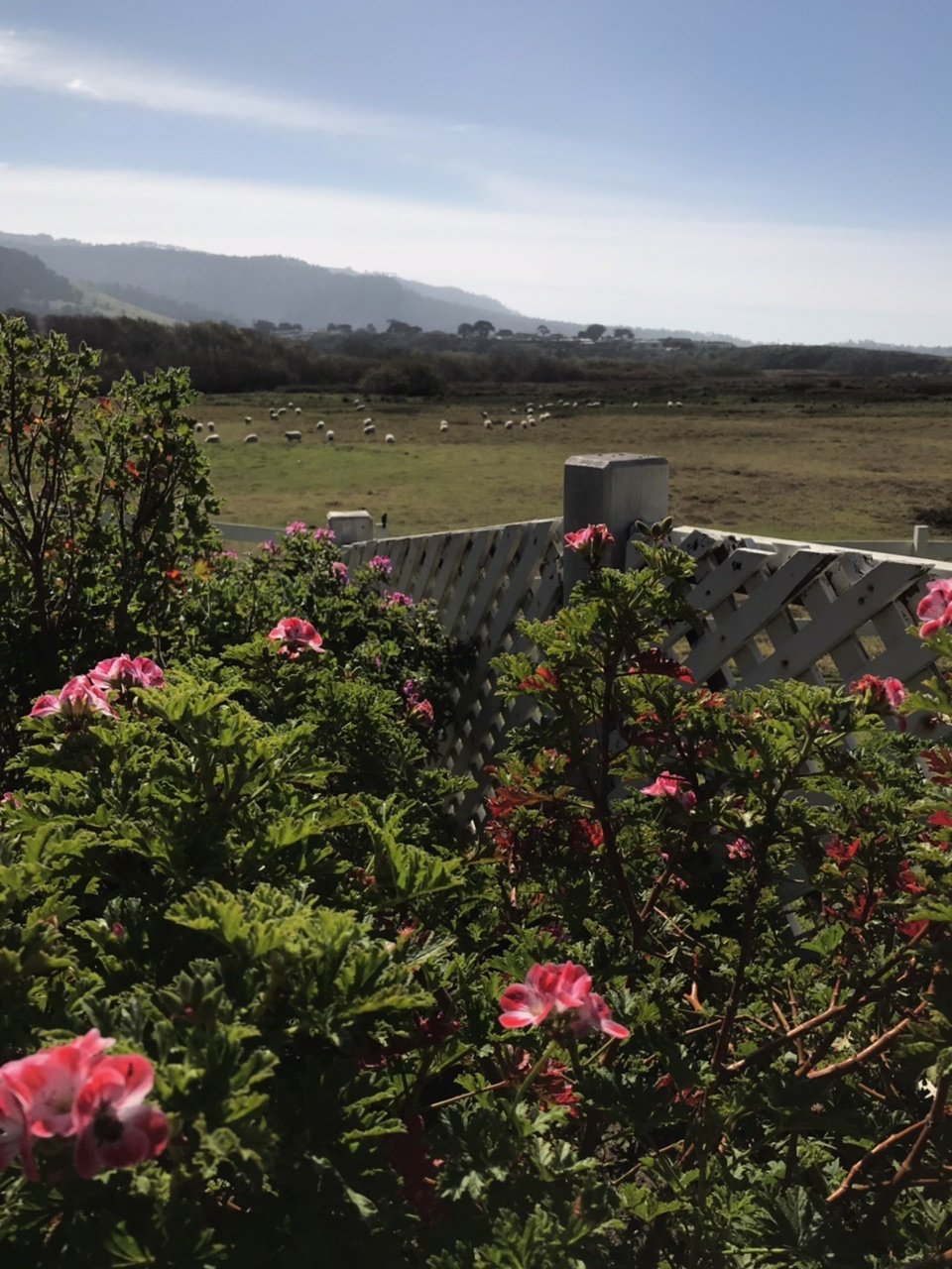 The following day we shared a continental breakfast in our room, then took a quick drive to The Mission Ranch. We walked hand in hand through the gardens and stood against a low fence taking in the pastoral landscape , sheep meandering through the idyllic setting.The bees bumbled in slow motion intoxicated by the geraniums. Catching their buzz, I felt pure bliss. I looked lazily at him, my Love, and again he smiled.