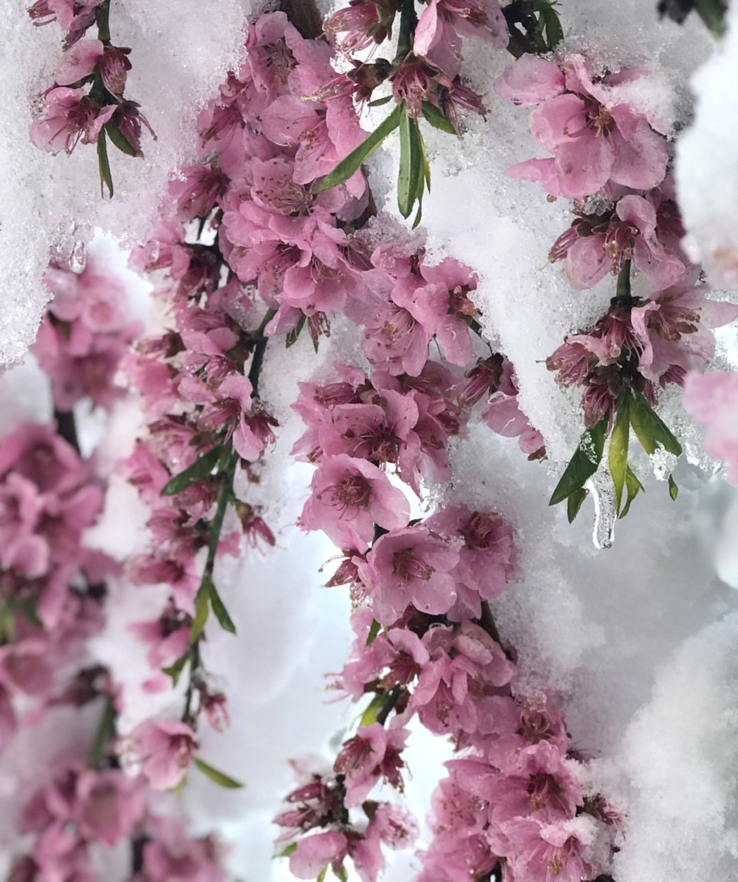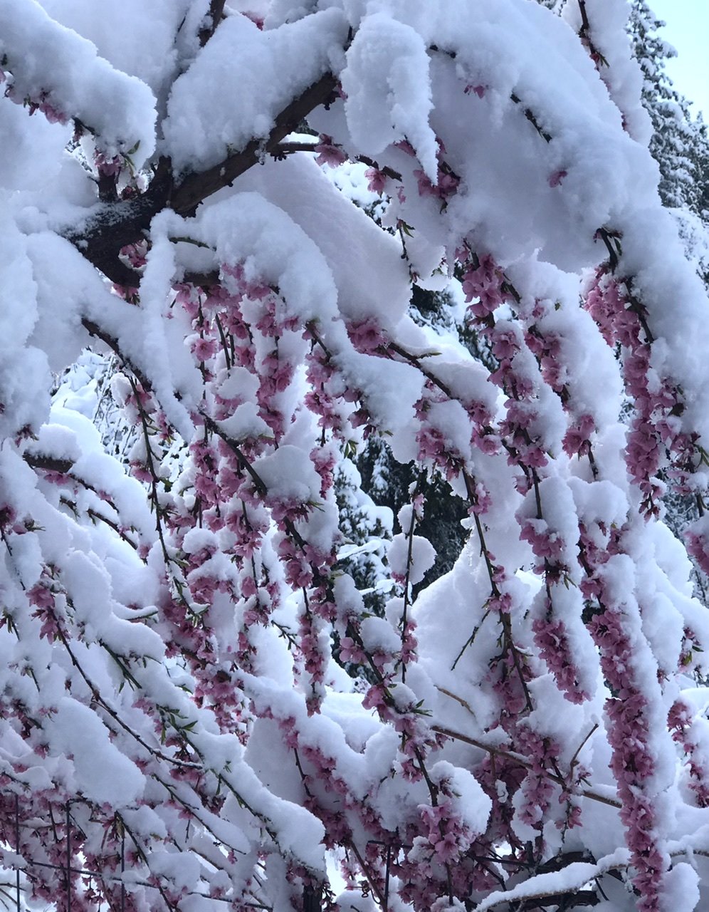 Draped in diamonds, our beloved blossoms bloomed elegant under the sparkling blanket gifted in the night. How could this wintry heaviness add such beauty? How? In the chill I both grieved and hoped. I grieved the loss of future fruit and hoped some would be protected and saved.