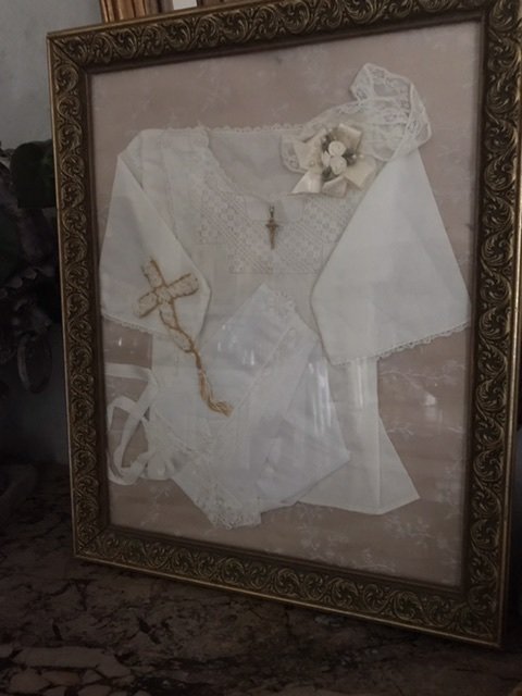 The frame contains a fabric collage that has hung on various walls, my baby shirt my grandmother made, a cross your godmother crocheted for us, flowers that crowned our daughter’s heads. So much love and beauty I've tried to gather and hold onto. I carefully set them aside and place the photo of you in it. I’m grateful for these reminders, these simple treasures.