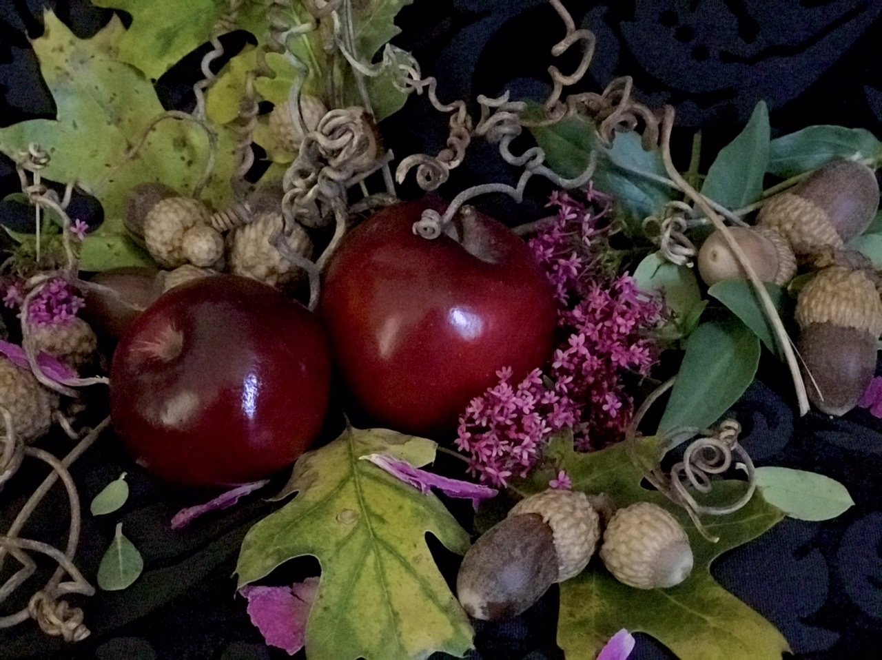 Over our table cloth I placed well used wedding gifts, pewter candle sticks and surrounded them with rosemary, acorns, grape tendrils, a few fallen leaves, keys to heaven and the last two deep red apples that were hanging from the tree this morning.